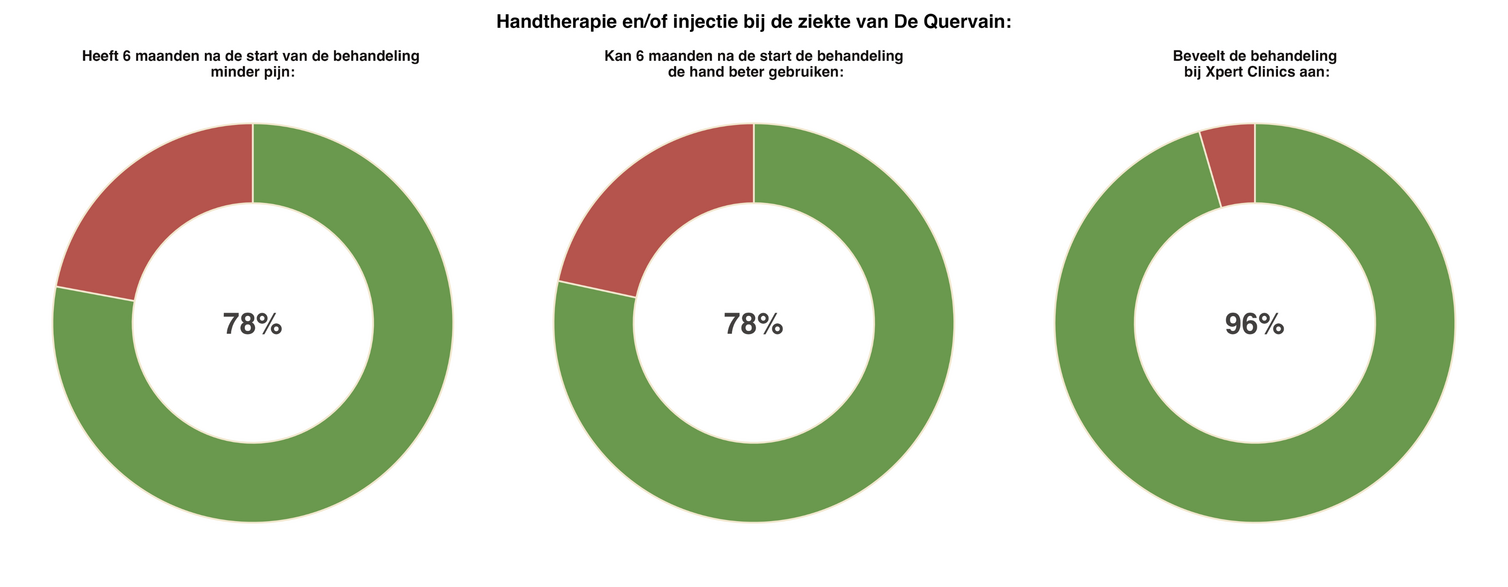 Bij Xpert Clinics, wordt 69% van de patiënten met de aandoening van De Quervain eerst behandeld met handtherapie, een spalk en eventueel een ontstekingsremmende injectie (hydrocortisone). Een deel van deze patiënten wordt later alsnog geopereerd. 30% van de patiënten wordt gelijk geopereerd. In 2025 hebben meer dan 1350 patiënten een injectie voor De Quervain gekregen en zijn meer dan 1150 patiënten voor De Quervain geopereerd.